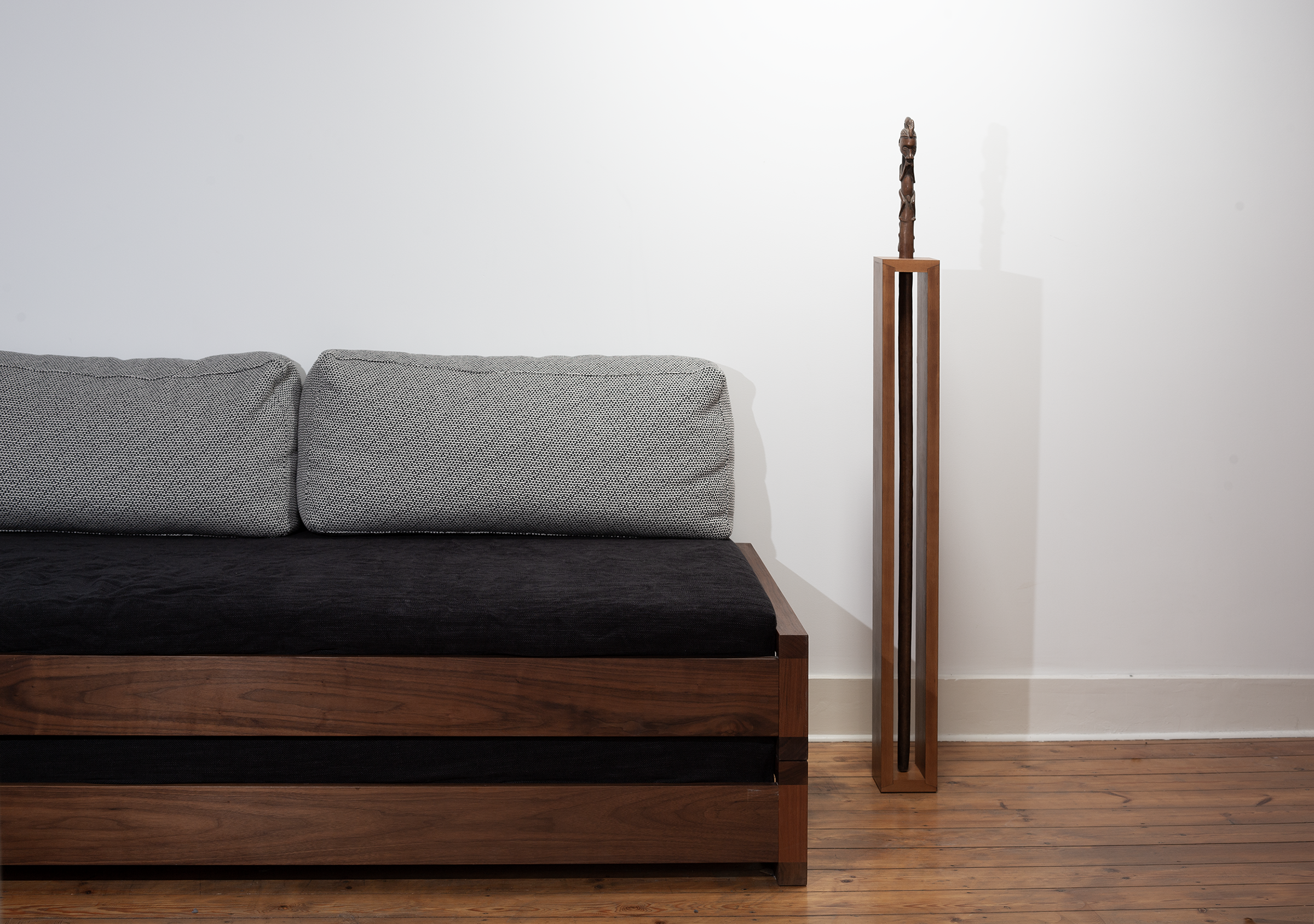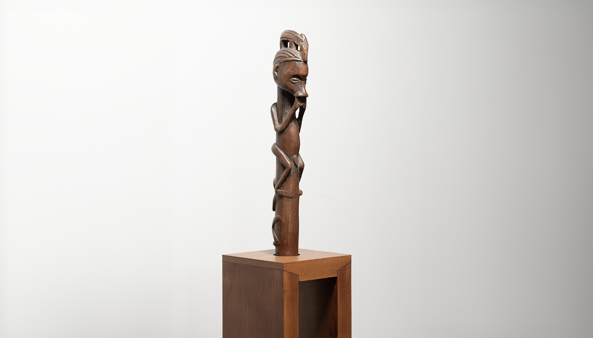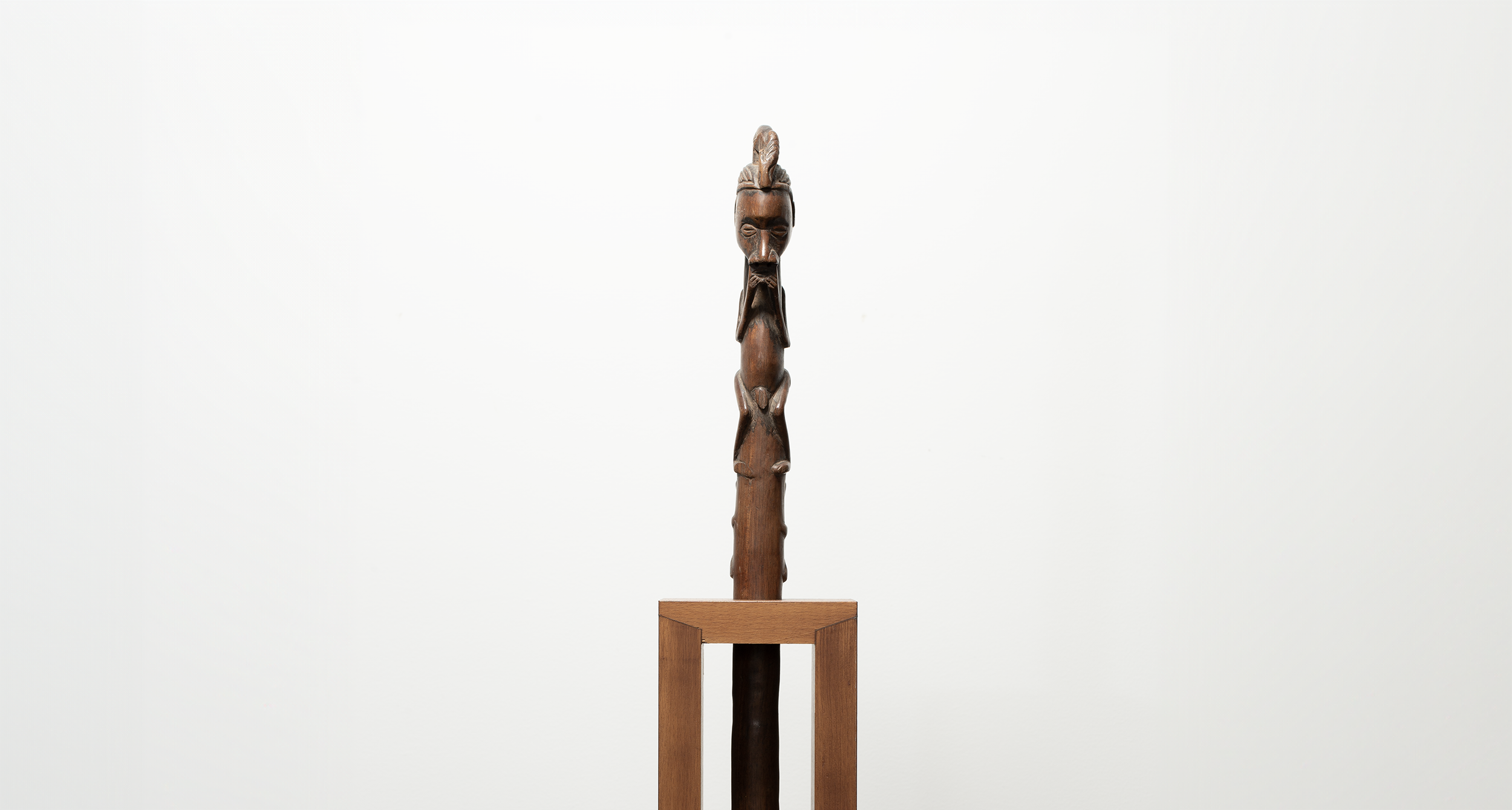 The staff shown below is such an example, where we used an open base to show the ethnographic aspect of the piece, while isolating the figurative part, which is presented on top of the wooden pedestal, as if it was a sculpture on its own.